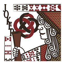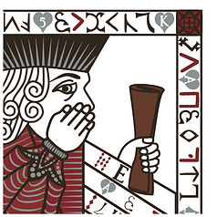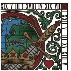 A message written in four different sets of characters, each of which appears in only a single suit. Using the indicated suit order of Heart, Club, Diamond, and Spade, read through each set of characters in order, this border says: "The Makers of these cards are certainly no mystery, they weave the cloth of history."
