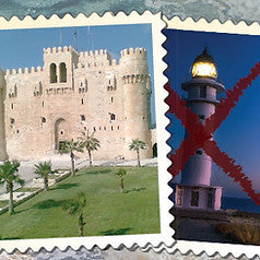 The top stamp depicts the Citadel of Qaitbay, which was built on the ruins of the lighthouse of Alexandria. It was constructed in 1477